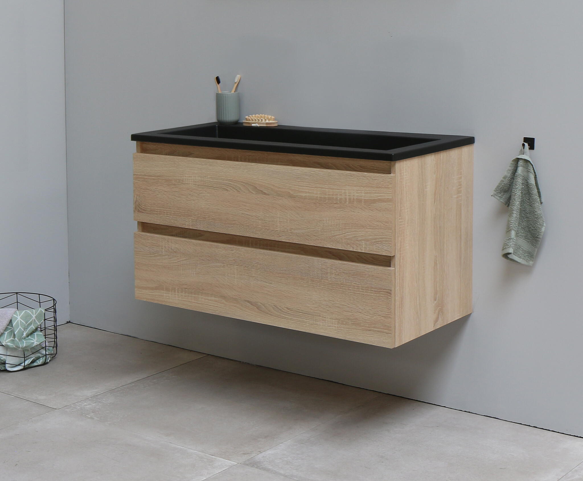 Solidline badkamermeubelset - 100cm - Keramiek - Mat zwart - 2 - Eiken - Zonder spiegel - Bouwpakket