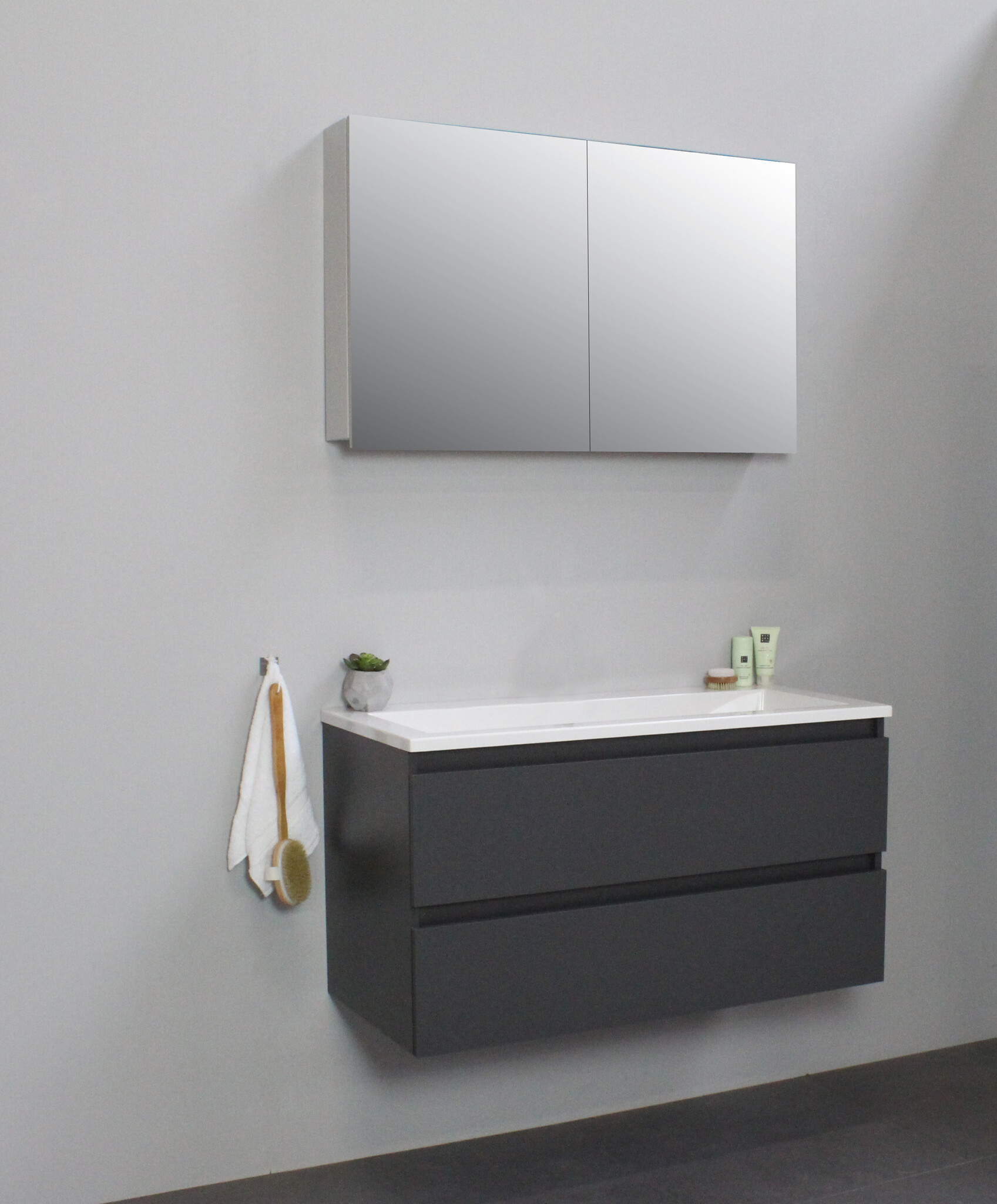 Solidline badkamermeubelset | 100cm | Keramiek | Wit | 0 | Mat antraciet | Met spiegelkast | Geassembleerd