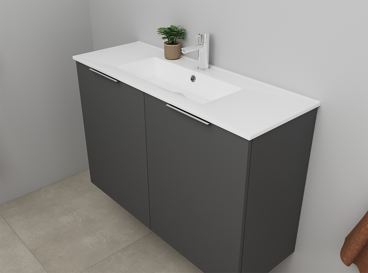Deze badkamermeubelset bestaat uit een onderkast met softclose lades, een keramische wastafel en wordt geleverd met spiegel en indirecte LED-verlichting. De set is uitgevoerd in mat antraciet en heeft een breedte van 100 cm. Dankzij het slimme ontwerp is dit meubel perfect voor zowel compacte als ruime badkamers.