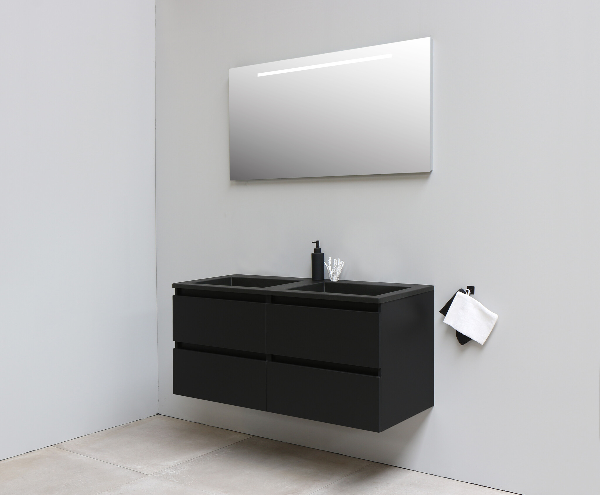 Solidline badkamermeubelset | 120cm | Acryl | Mat zwart | 0 | Mat zwart | Spiegel met LED verlichting | Bouwpakket