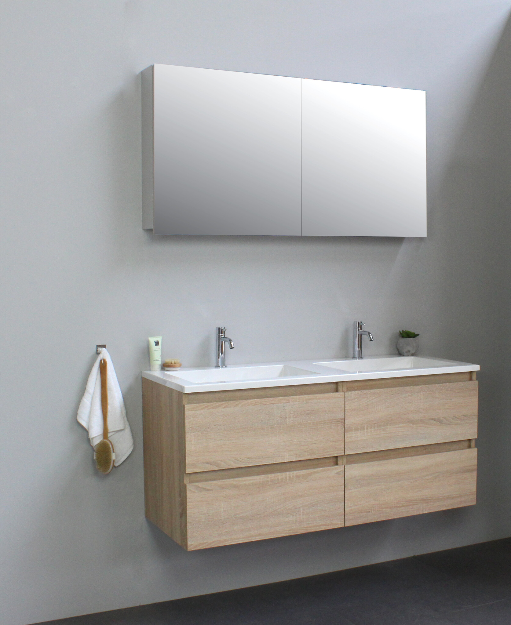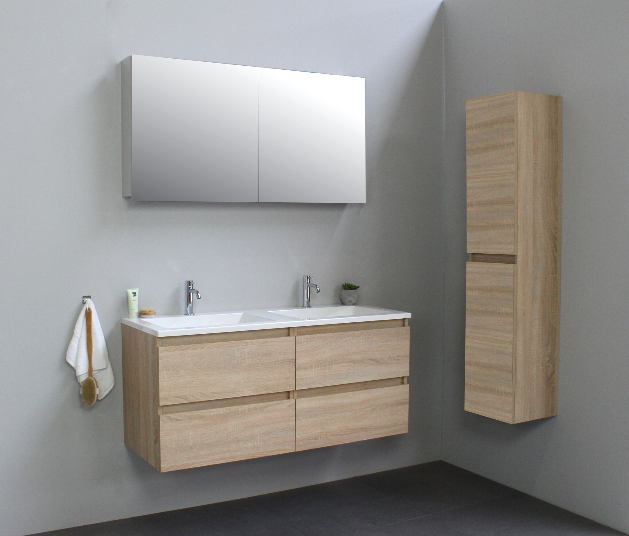 Offerte aanvraag voor Solidline badkamermeubelset | 120cm | Acryl | Wit | 2 | Eiken | Met spiegelkast | Geassembleerd