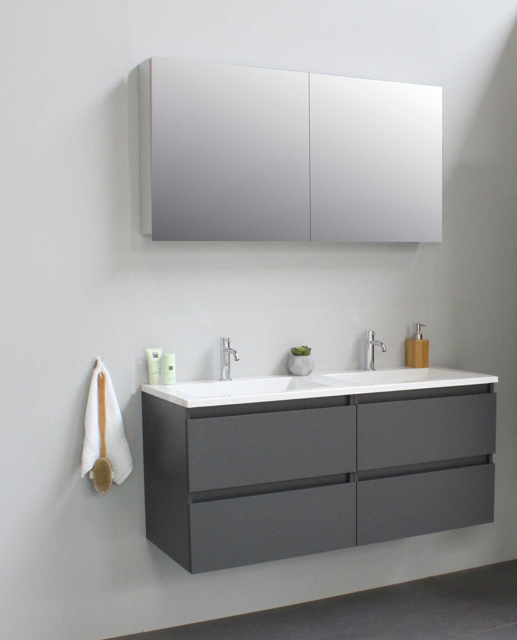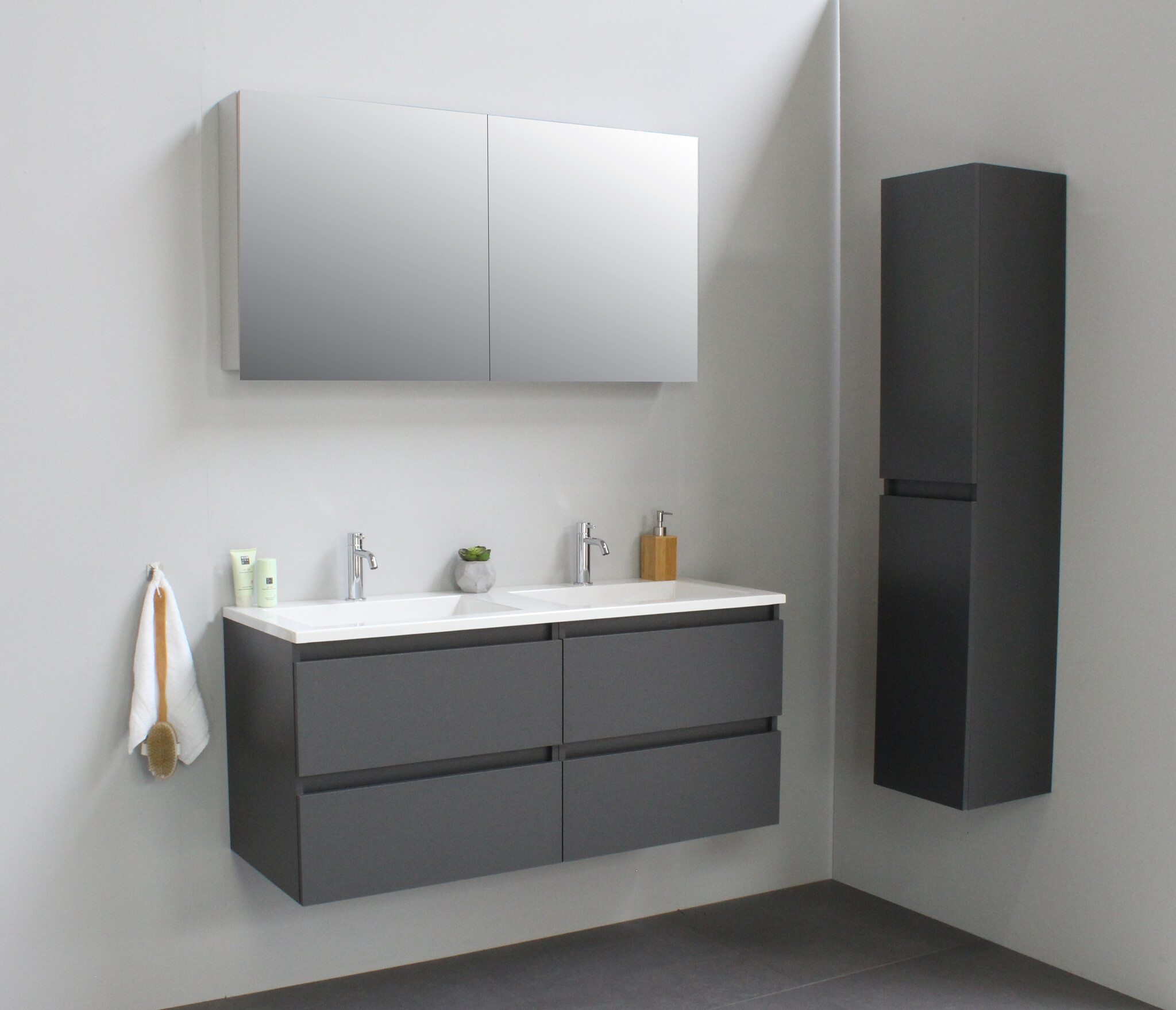 Solidline badkamermeubelset | 120cm | Acryl | Wit | 2 | Mat antraciet | Met spiegelkast | Geassembleerd