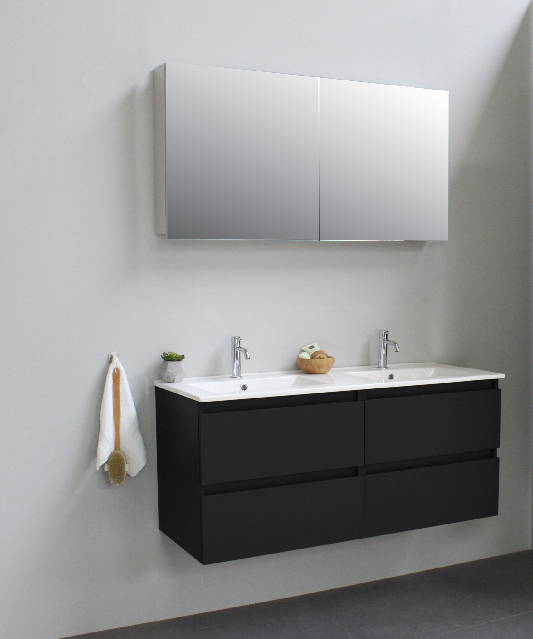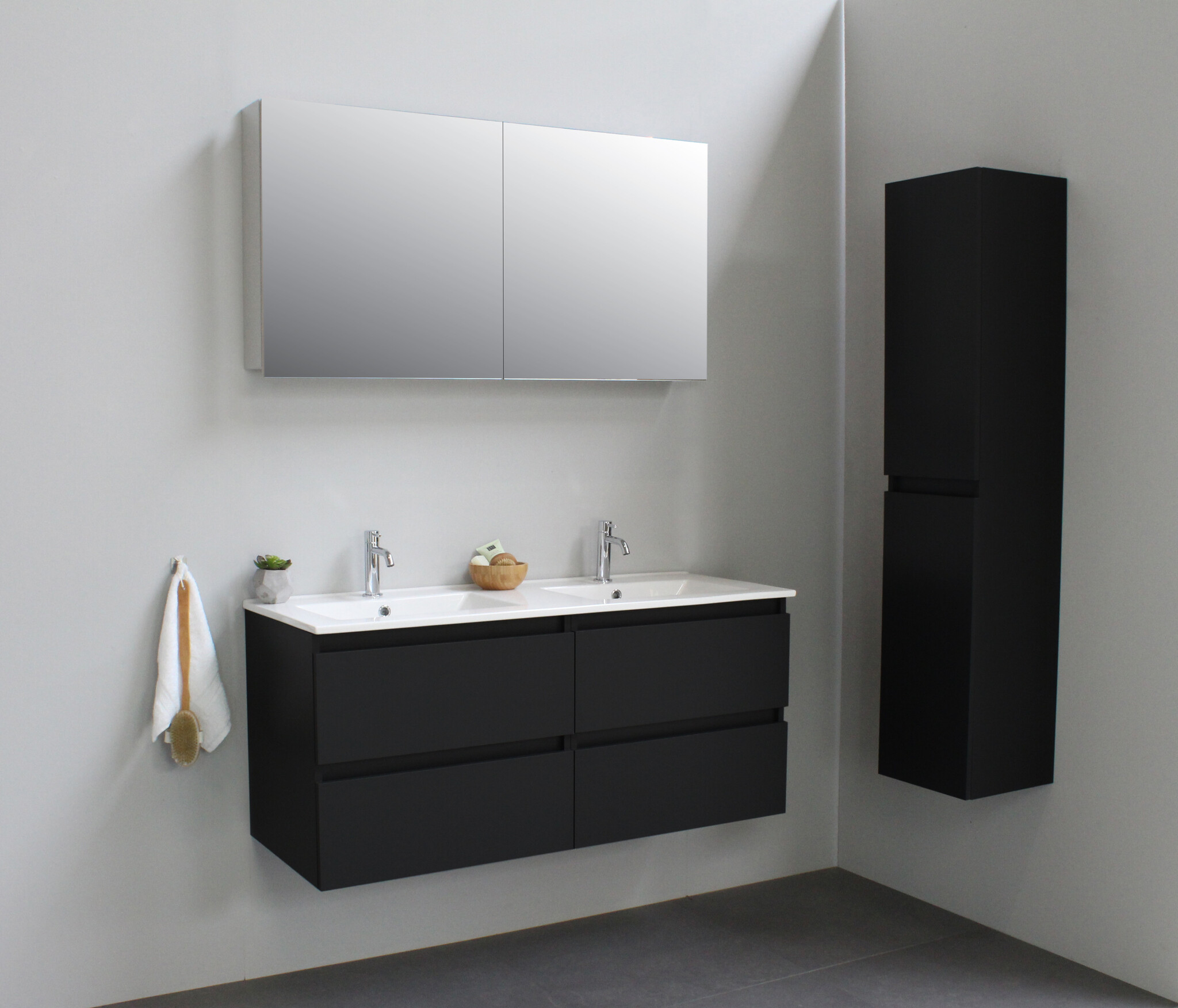 Offerte aanvraag voor Solidline badkamermeubelset | 120cm | Keramiek | Wit | 2 | Mat zwart | Met spiegelkast | Geassembleerd