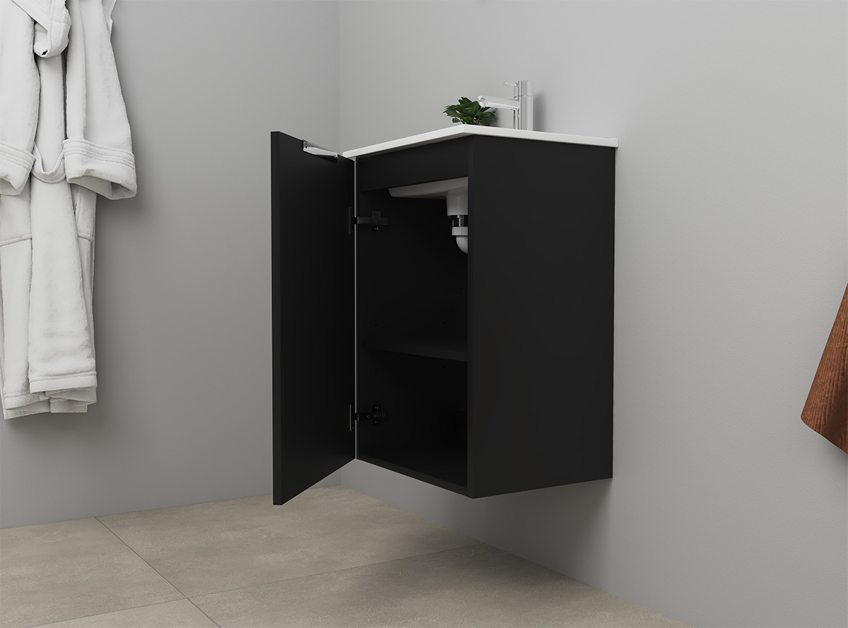 Deze badkamermeubelset bestaat uit een onderkast met softclose lades, een keramische wastafel en wordt geleverd met spiegel en indirecte LED-verlichting. De set is uitgevoerd in mat zwart en heeft een breedte van 45 cm. Dankzij het slimme ontwerp is dit meubel perfect voor zowel compacte als ruime badkamers.