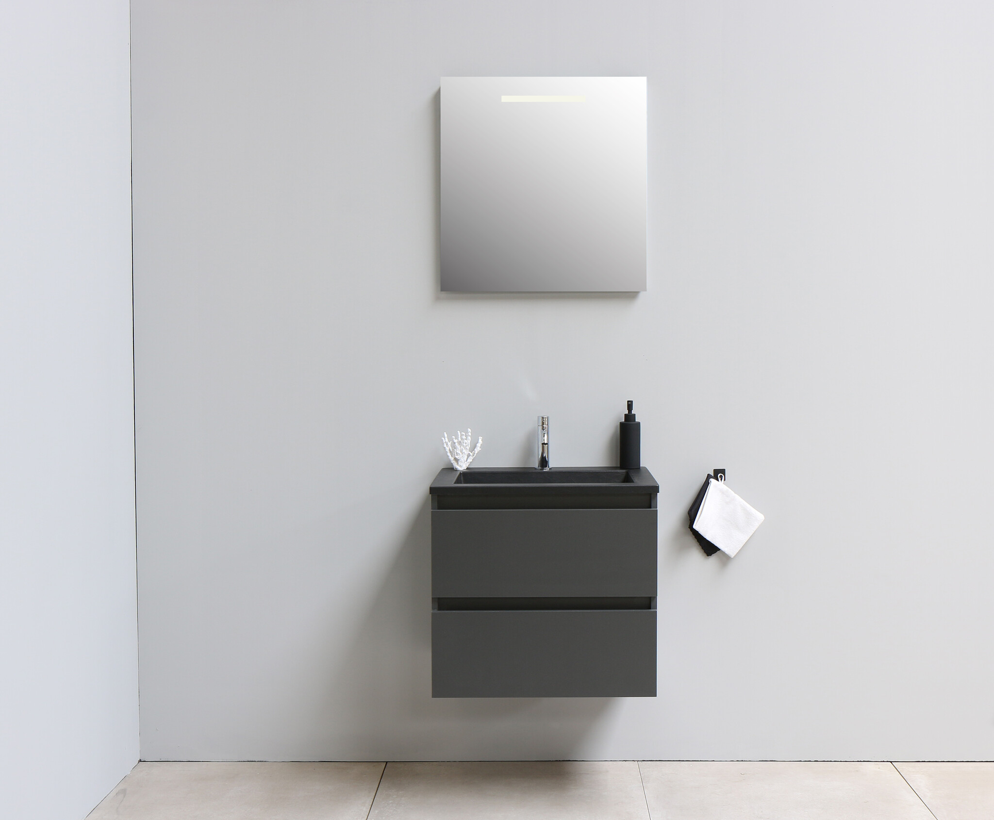 Solidline badkamermeubelset | 60cm | Acryl | Mat zwart | 1 | Mat antraciet | Spiegel met LED verlichting | Geassembleerd