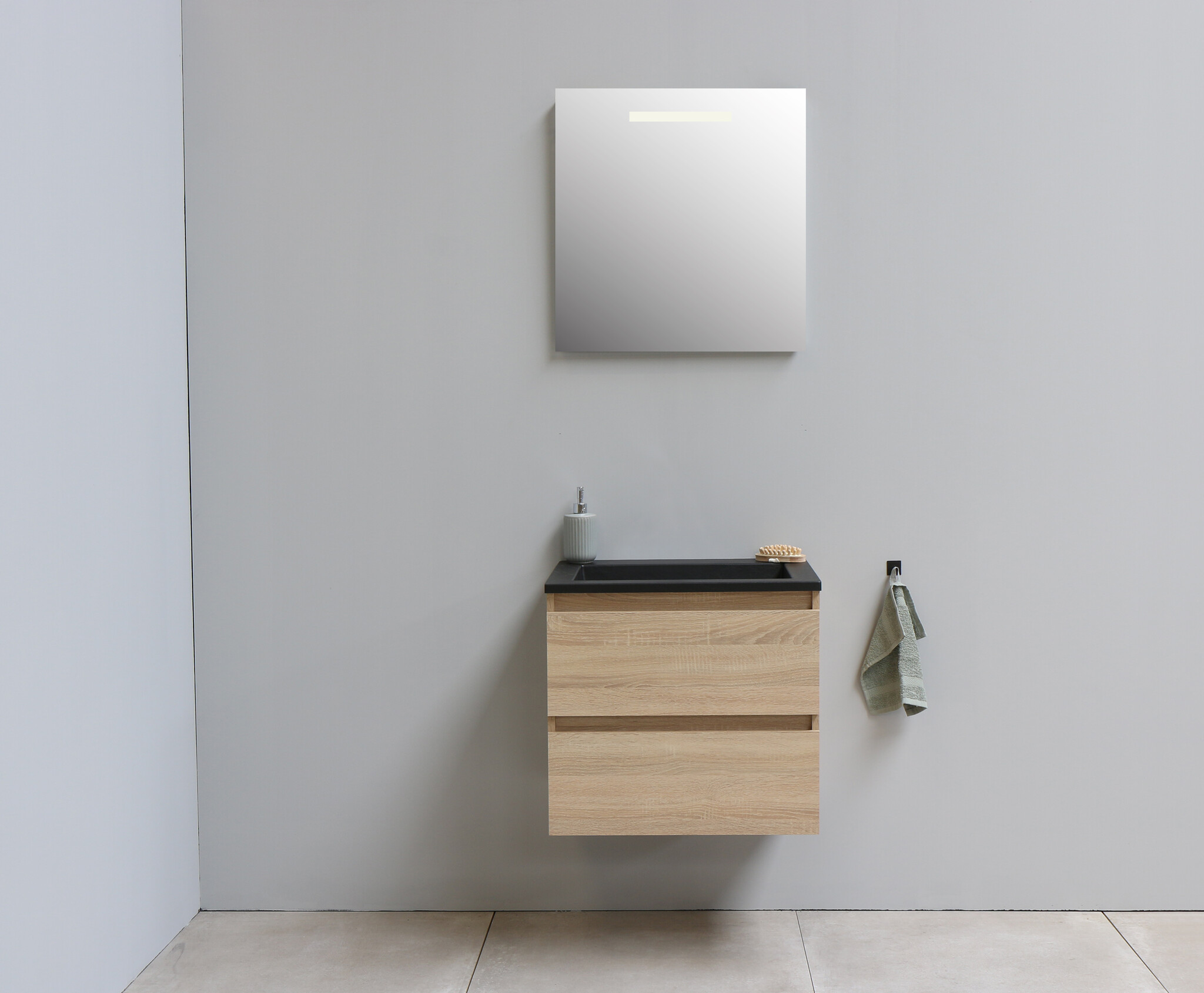 Solidline badkamermeubelset - 60cm - Acryl - Mat zwart - 2 - Eiken - Spiegel met LED verlichting - Bouwpakket