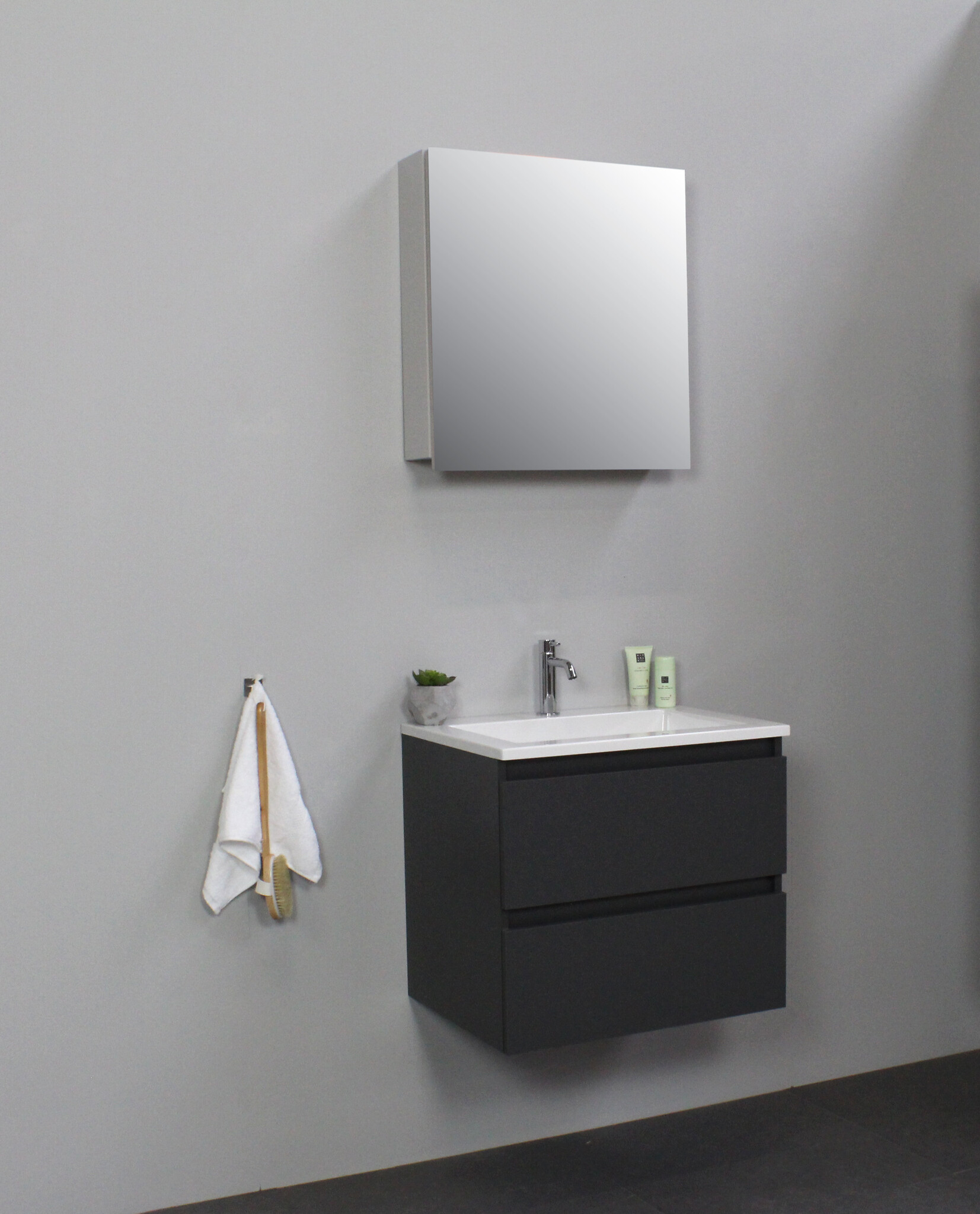 Solidline badkamermeubelset | 60cm | Acryl | Wit | 1 | Mat antraciet | Met spiegelkast | Bouwpakket