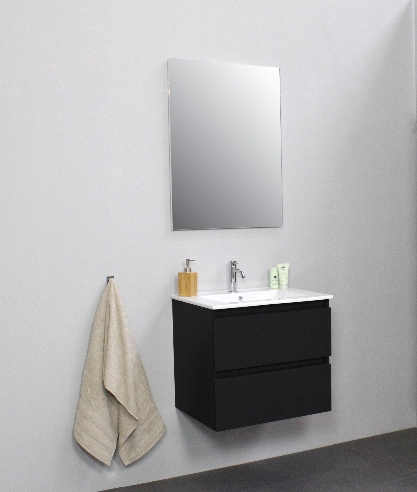 Offerte aanvraag voor Solidline badkamermeubelset | 60cm | Keramiek | Wit | 1 | Mat zwart | Standaard spiegel | Bouwpakket