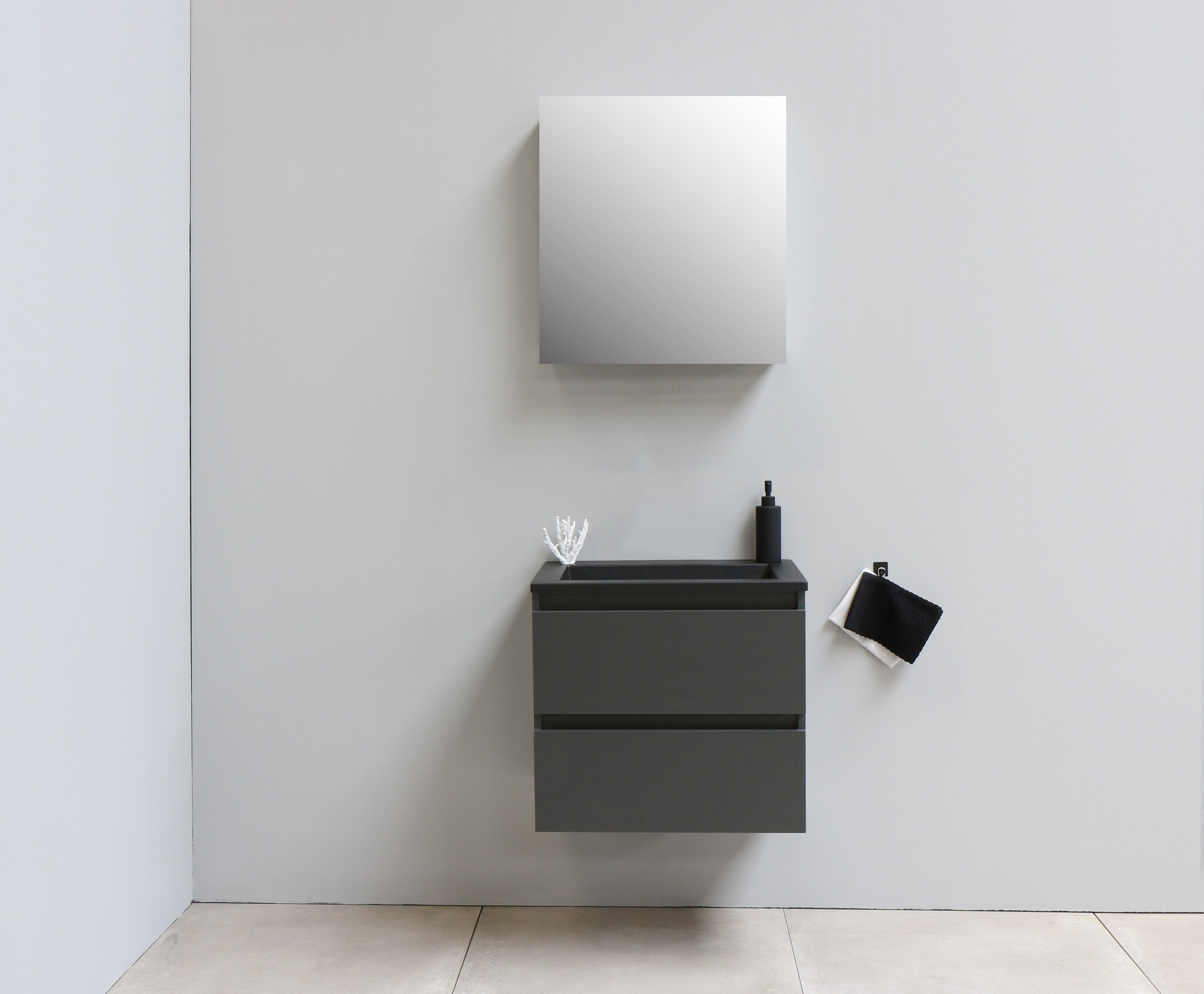 Solidline badkamermeubelset - 60cm - Keramiek - Mat zwart - 2 - Mat antraciet - Met spiegelkast - Geassembleerd