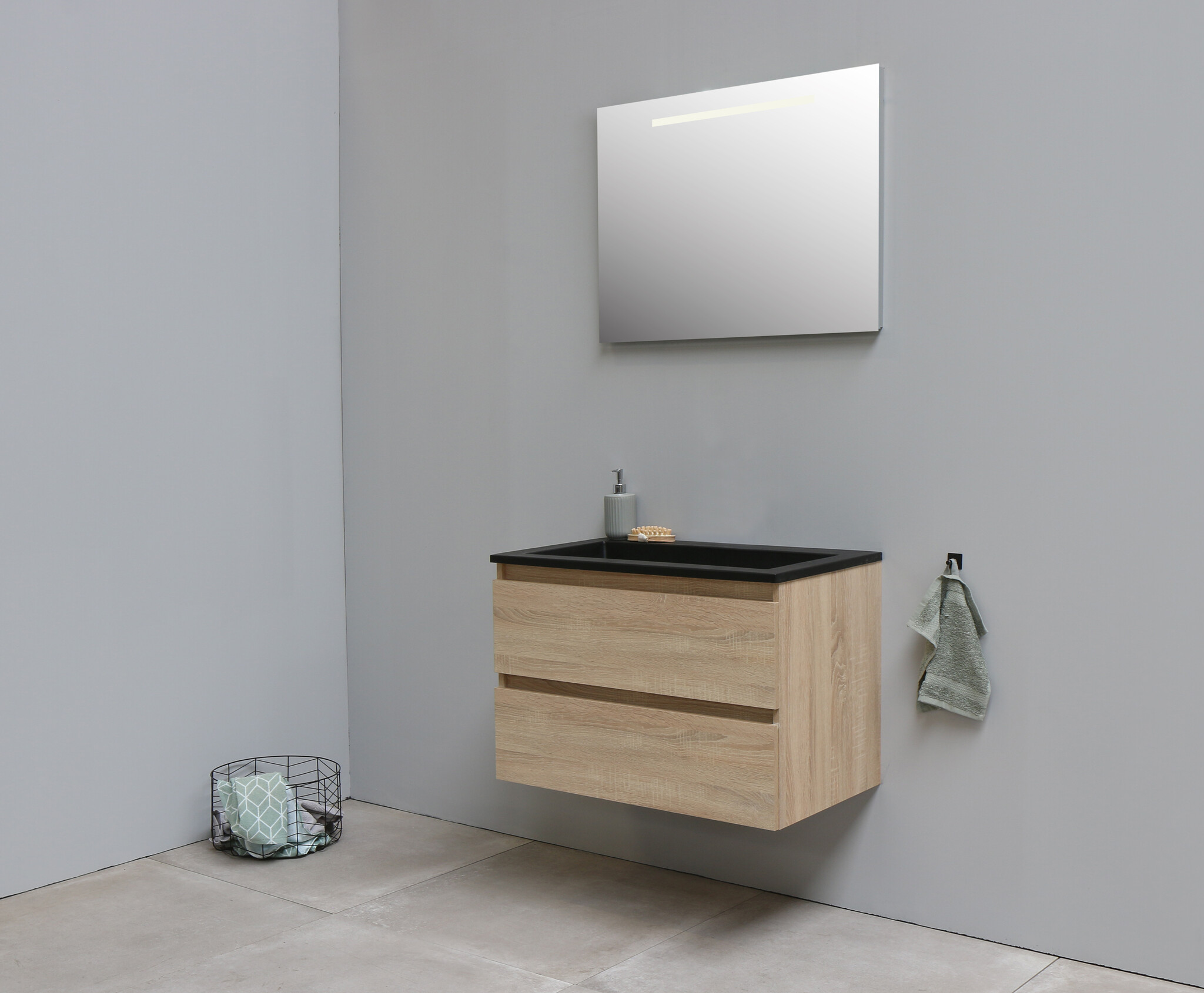 Solidline badkamermeubelset | 80cm | Acryl | Mat zwart | 0 | Eiken | Spiegel met LED verlichting | Bouwpakket