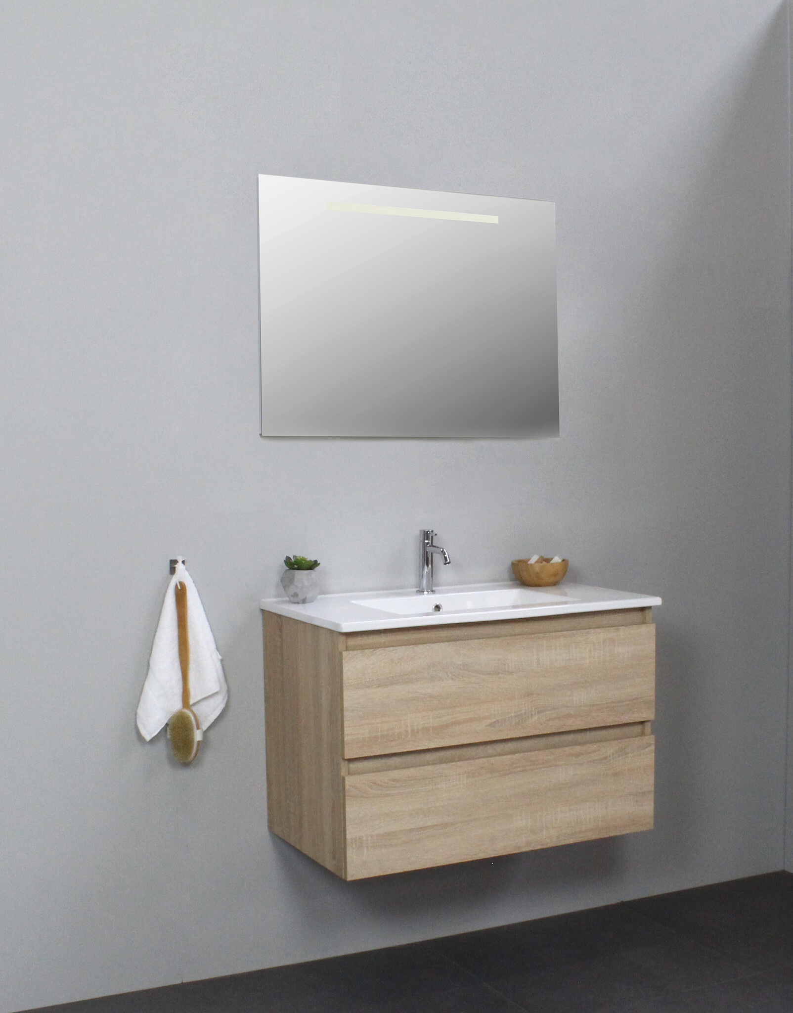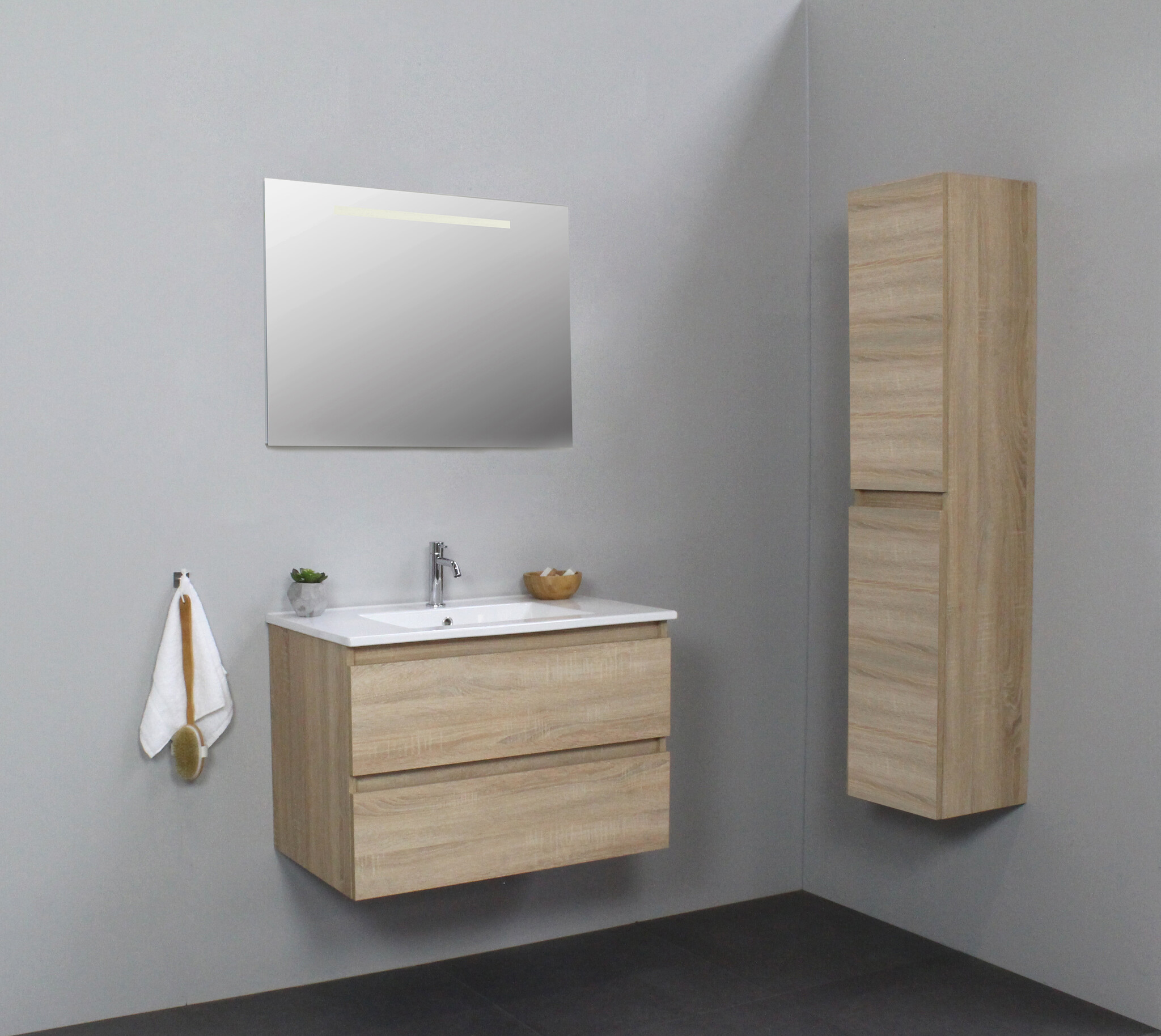 Solidline badkamermeubelset | 80cm | Keramiek | Wit | 1 | Eiken | Spiegel met LED verlichting | Geassembleerd