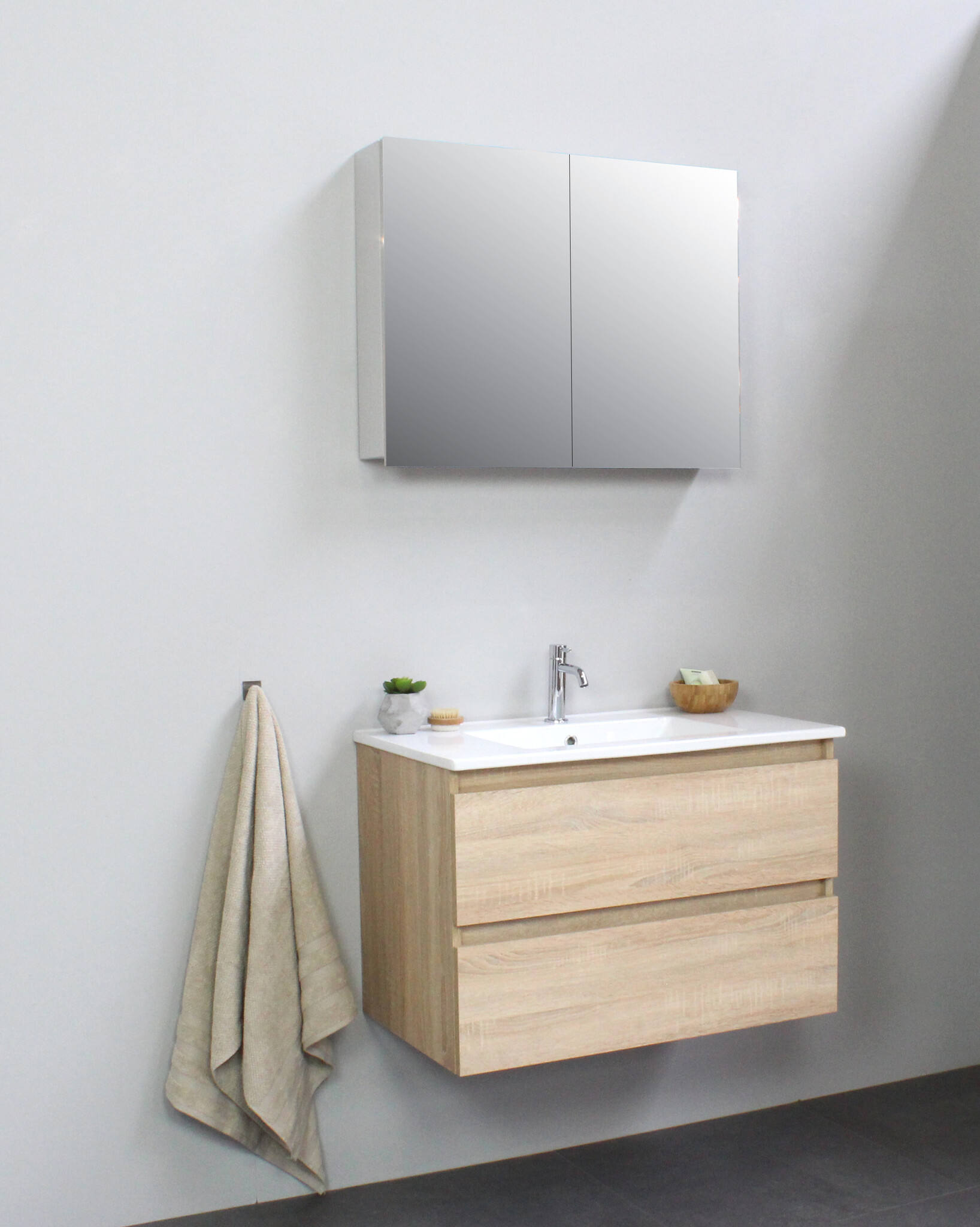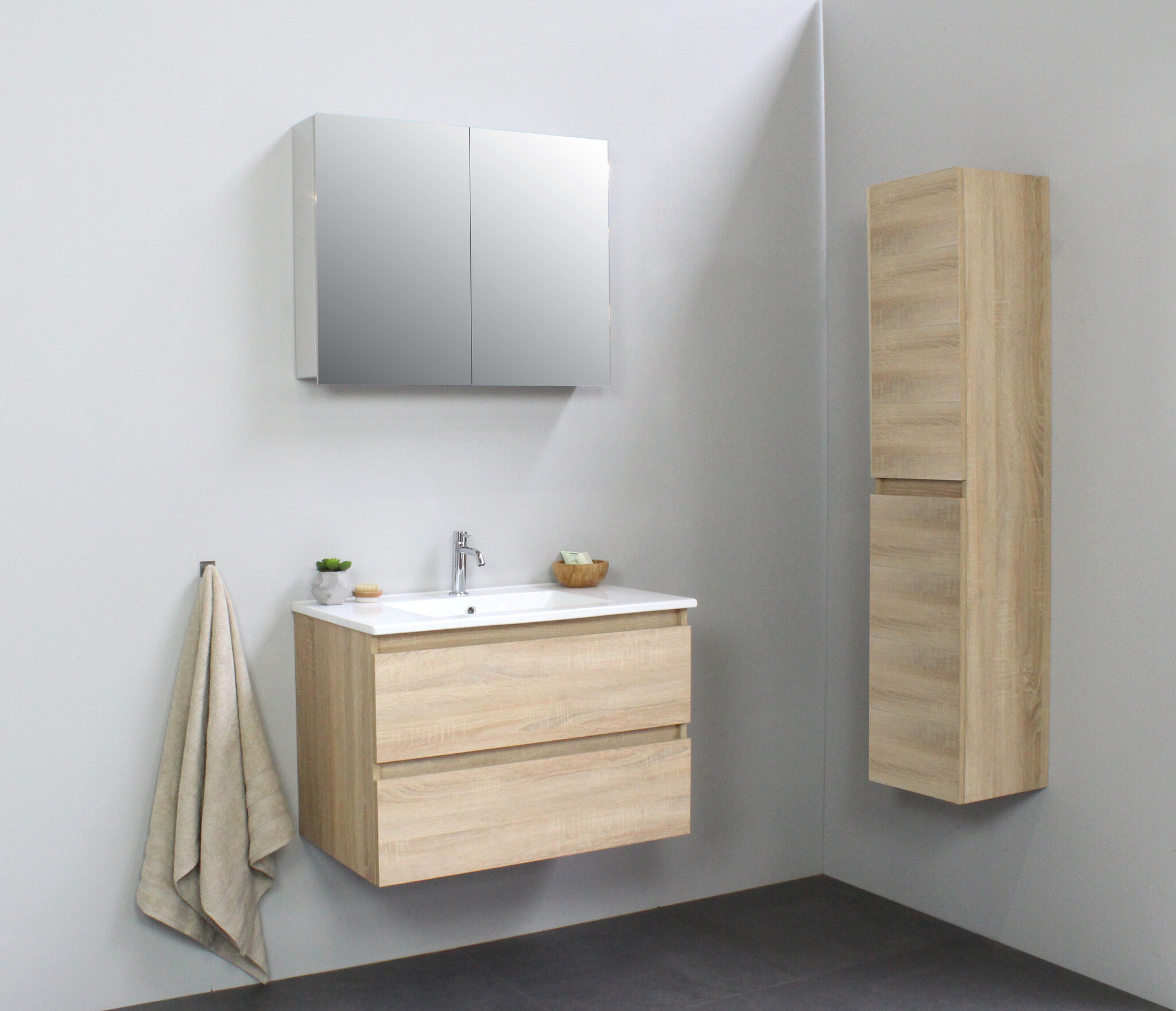 Offerte aanvraag voor Solidline badkamermeubelset | 80cm | Keramiek | Wit | 1 | Eiken | Met spiegelkast | Geassembleerd