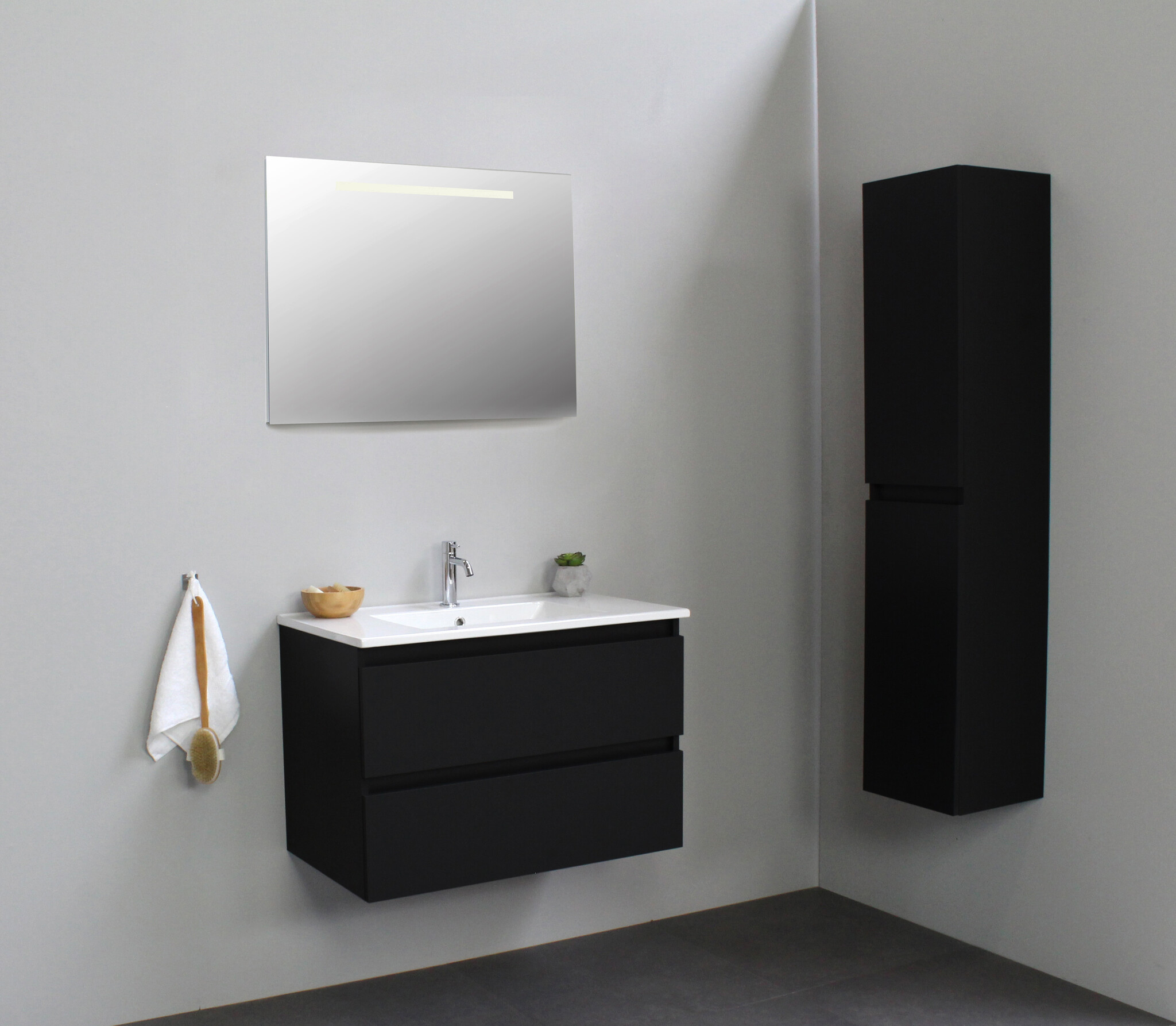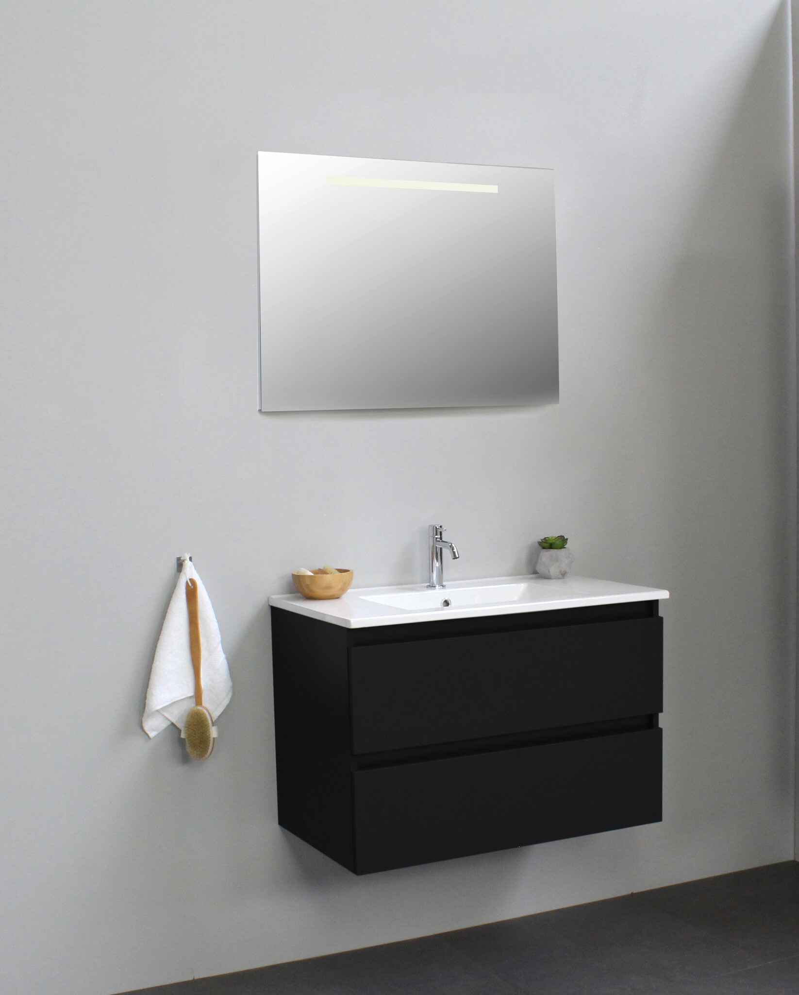 Solidline badkamermeubelset | 80cm | Keramiek | Wit | 1 | Mat zwart | Spiegel met LED verlichting | Geassembleerd