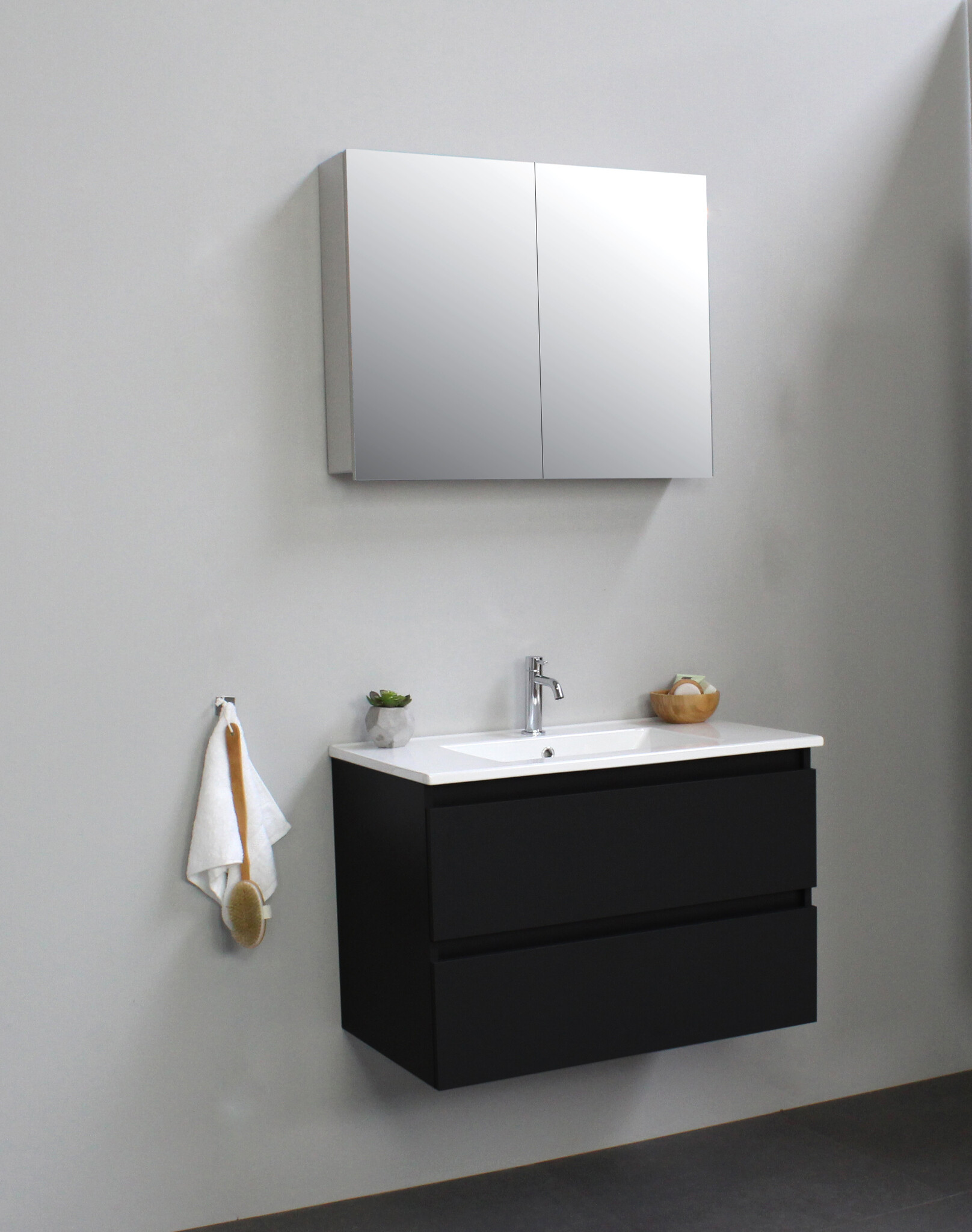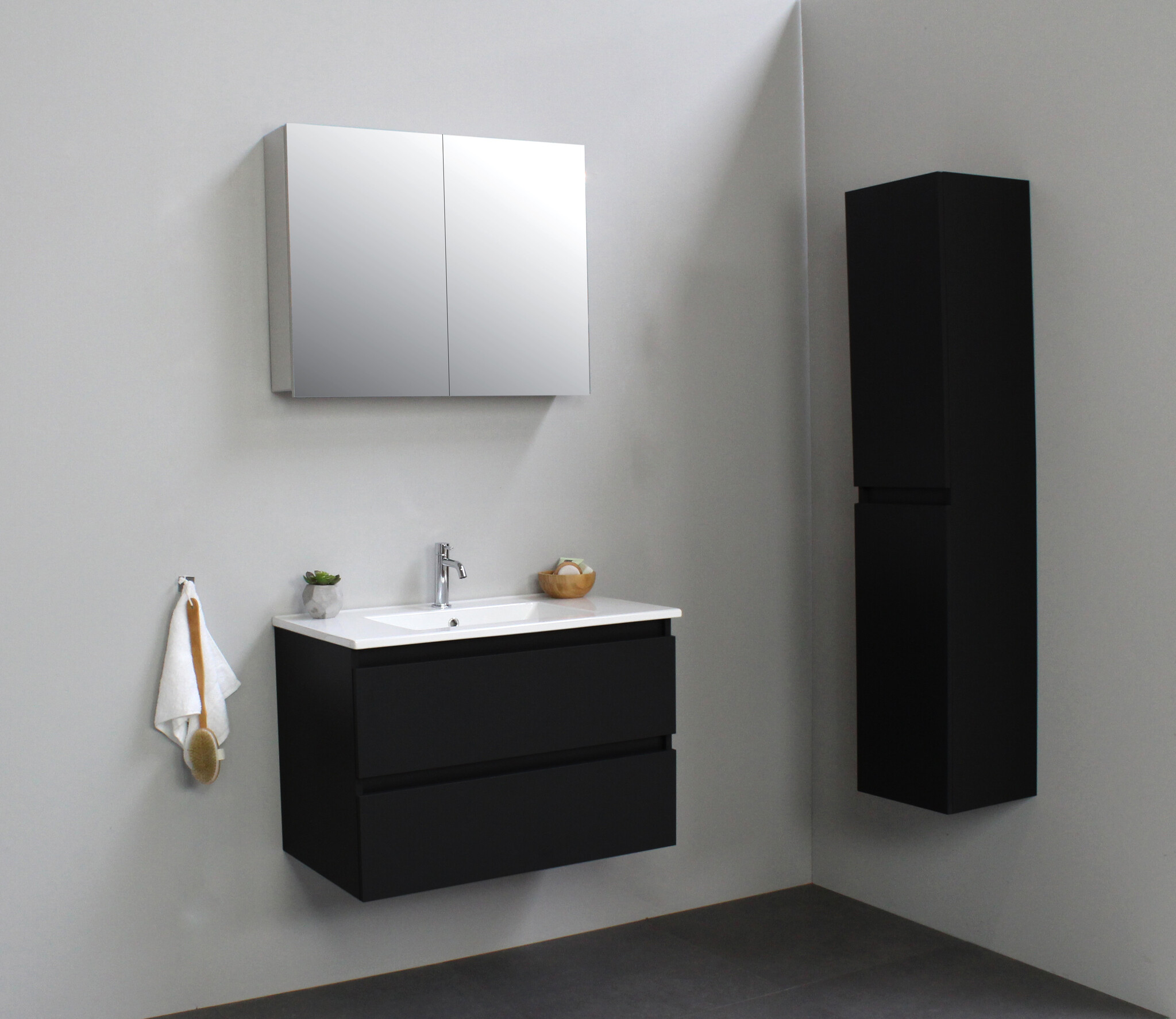 Solidline badkamermeubelset | 80cm | Keramiek | Wit | 1 | Mat zwart | Met spiegelkast | Geassembleerd