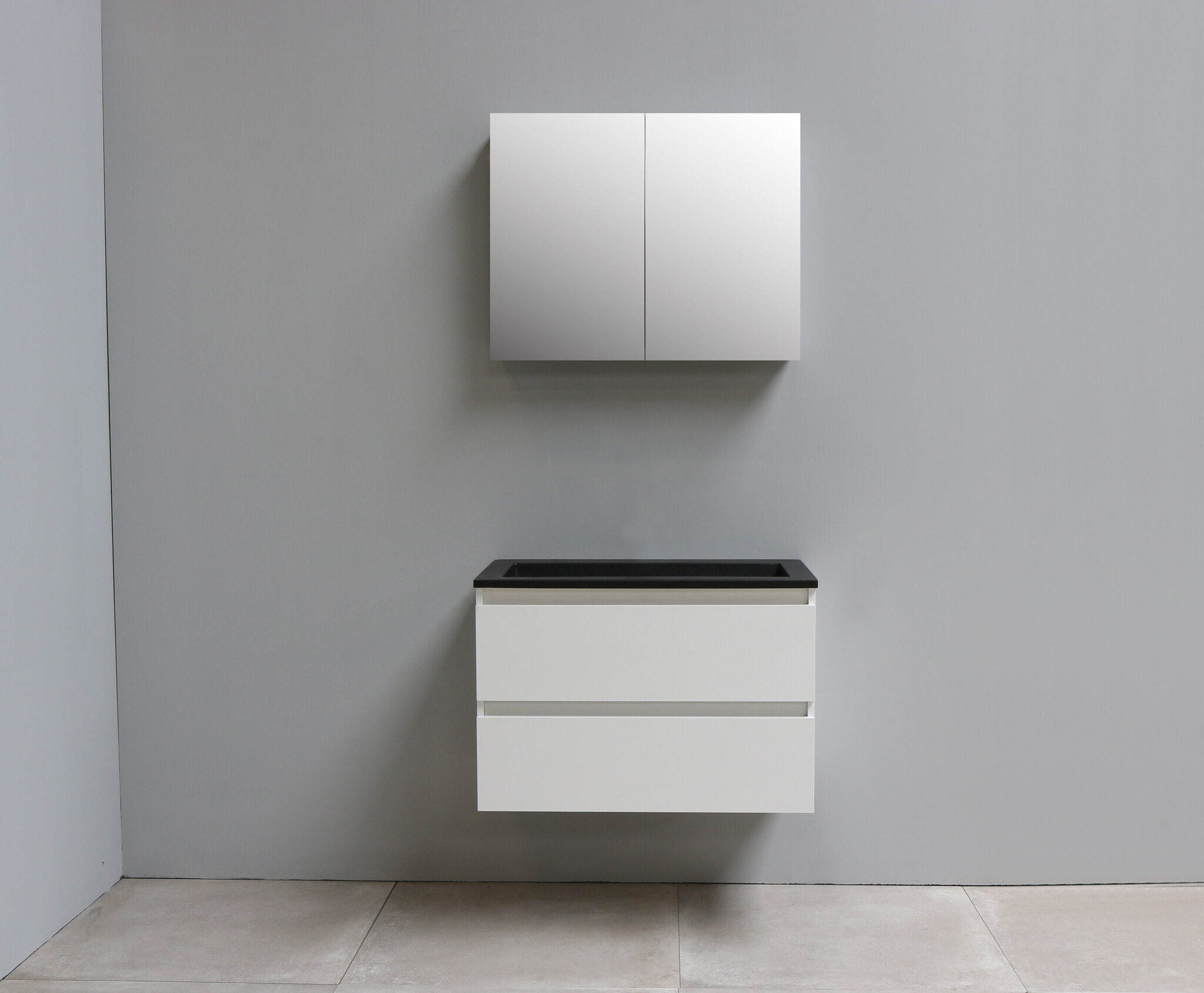 Solidline badkamermeubelset | 80cm | Keramiek | Mat zwart | 0 | Hoogglans wit | Met spiegelkast | Geassembleerd