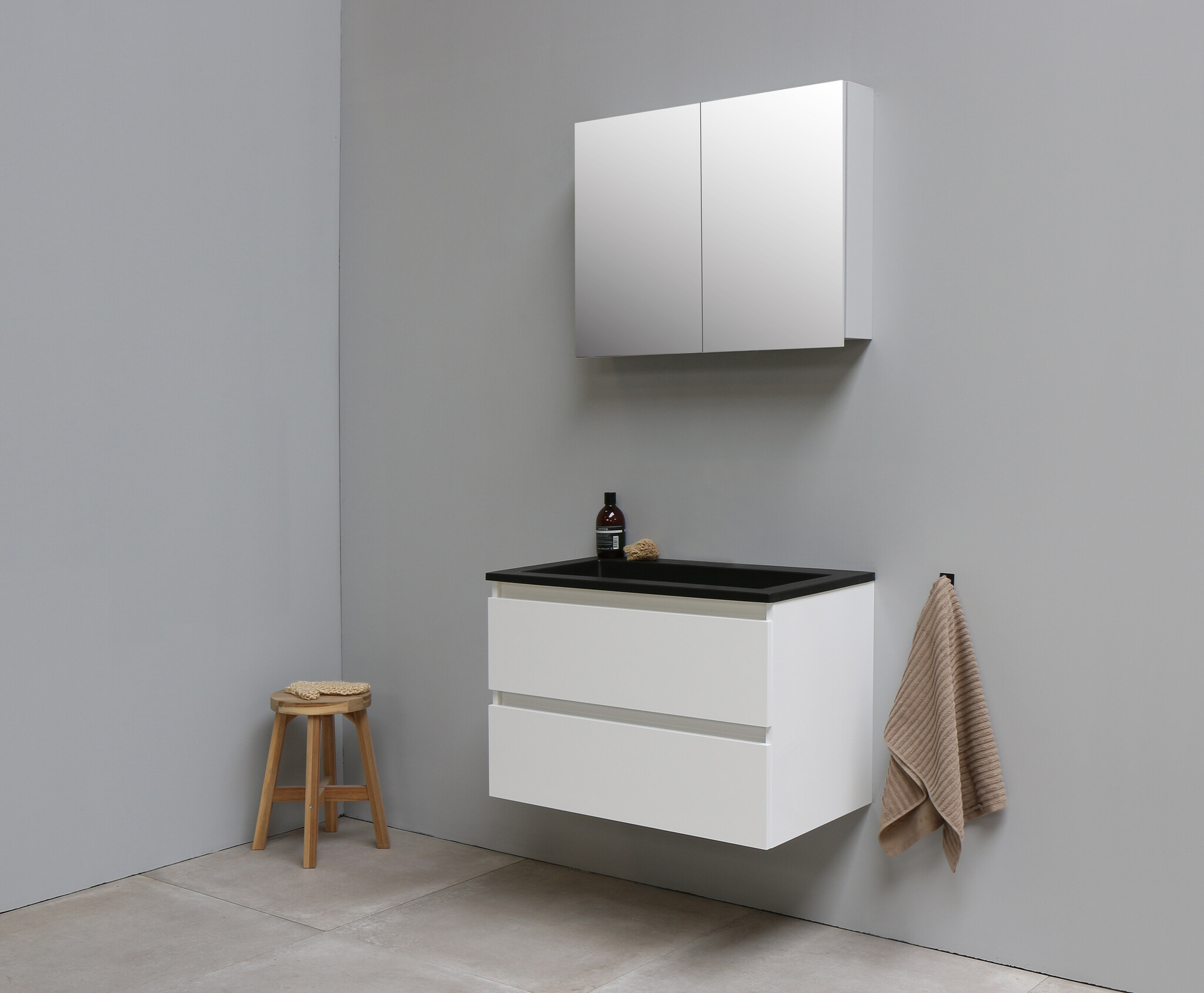 Solidline badkamermeubelset | 80cm | Keramiek | Mat zwart | 1 | Hoogglans wit | Met spiegelkast | Bouwpakket