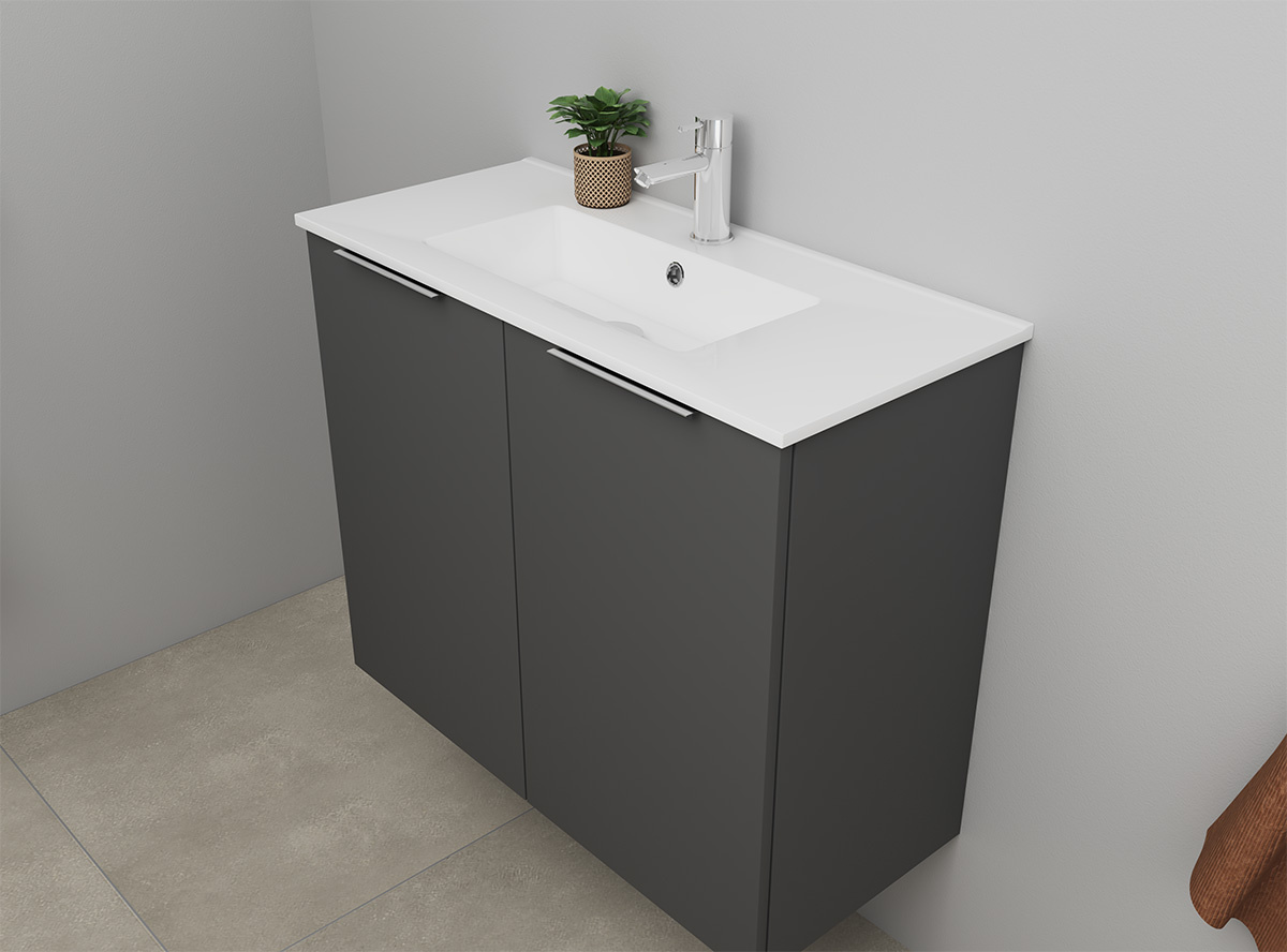 Deze badkamermeubelset bestaat uit een onderkast met softclose lades, een keramische wastafel en wordt geleverd met spiegel en indirecte LED-verlichting. De set is uitgevoerd in mat antraciet en heeft een breedte van 80 cm. Dankzij het slimme ontwerp is dit meubel perfect voor zowel compacte als ruime badkamers.
