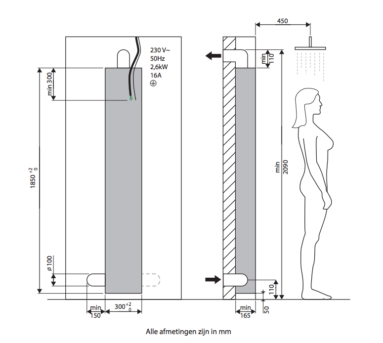 Met een vermogen van 2600 W en voeding op 230 V / 50 Hz wordt de Sunshower Deluxe op een aparte groep aangesloten. Er is rekening gehouden met ventilatiekanalen voor aan- en afvoer van koellucht. Laat de inbouwopening, elektra en ventilatie altijd door een vakman voorbereiden volgens de officiële montagevoorschriften, zodat je jarenlang zorgeloos van je Sunshower kunt genieten.