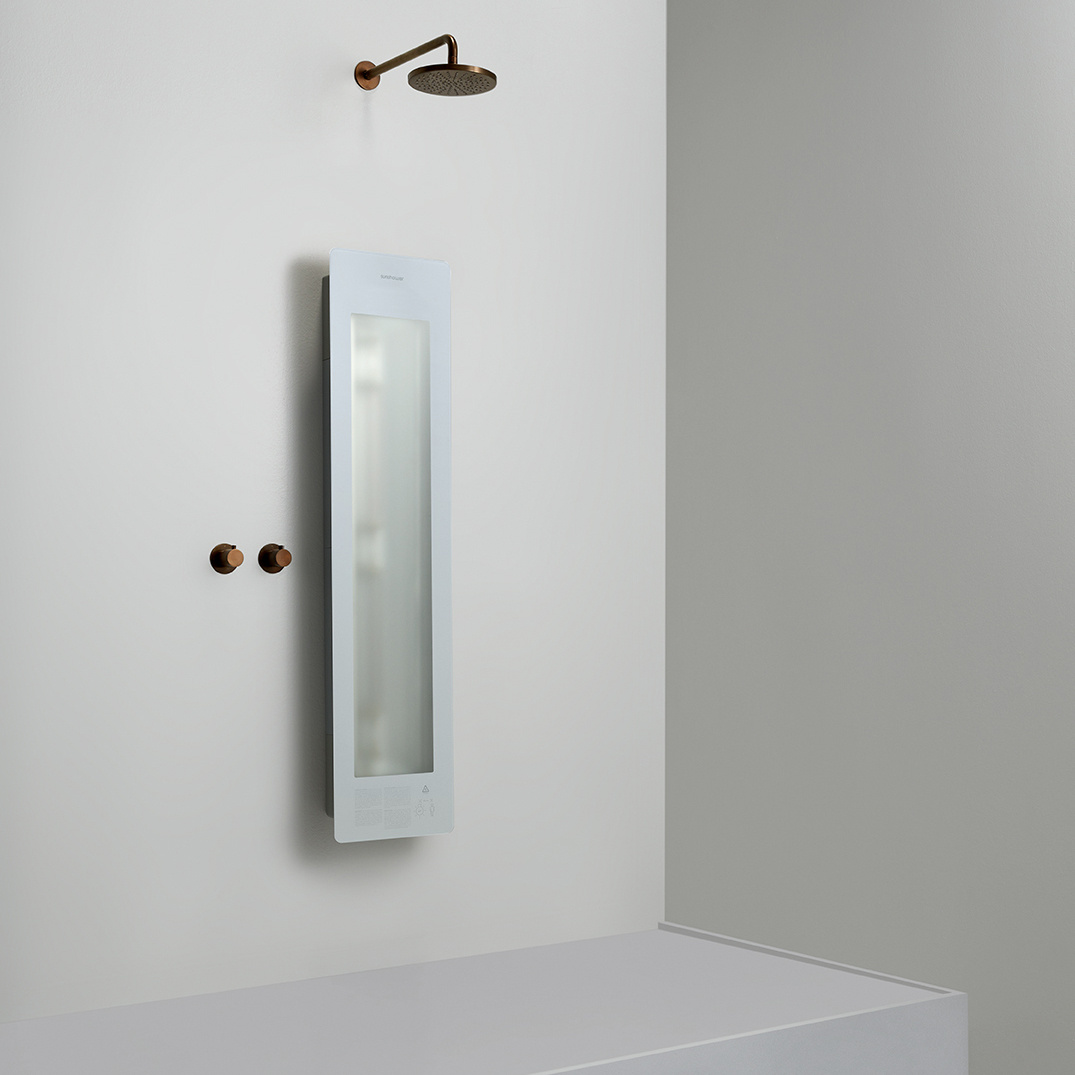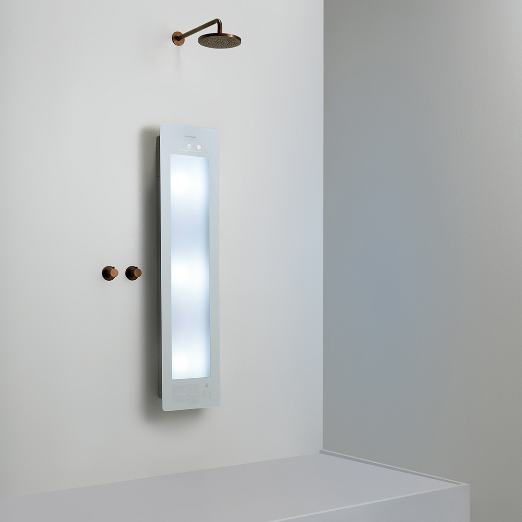 De Sunshower Plus M in wit combineert infraroodwarmte met laag gedoseerd UV-licht en wordt vlak tegen de wand gemonteerd. Het Medium-formaat behandelt ongeveer 3/4 van je lichaam, precies waar je dagelijks profijt van hebt: nek, schouders, rug en bovenbenen.