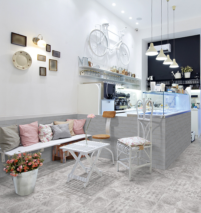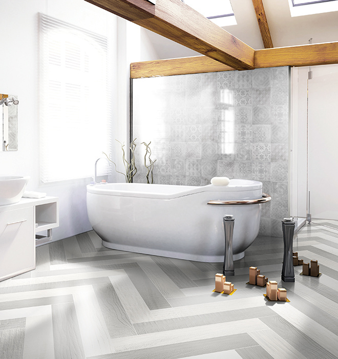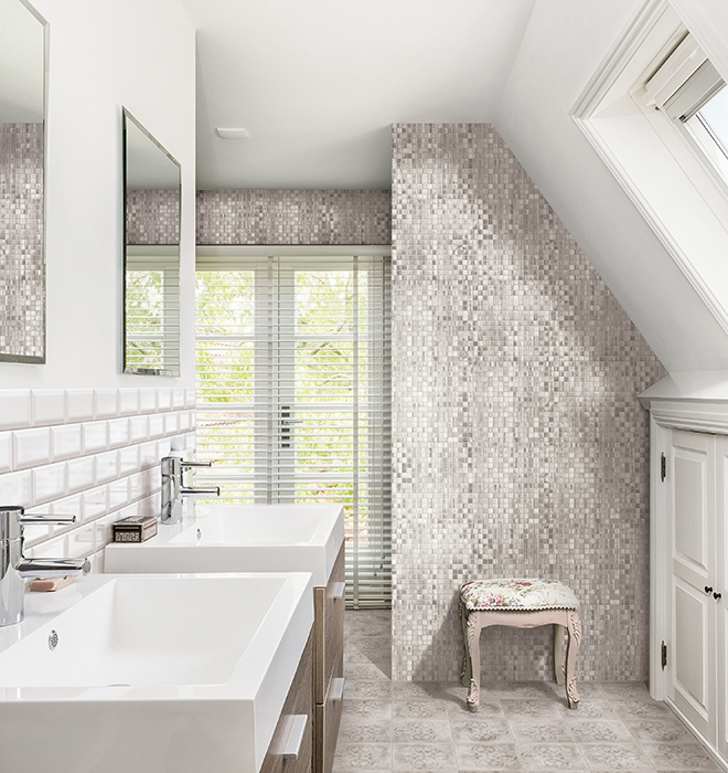 - Creëer een visueel contrast door deze tegel te combineren met zwarte en metalen accenten.