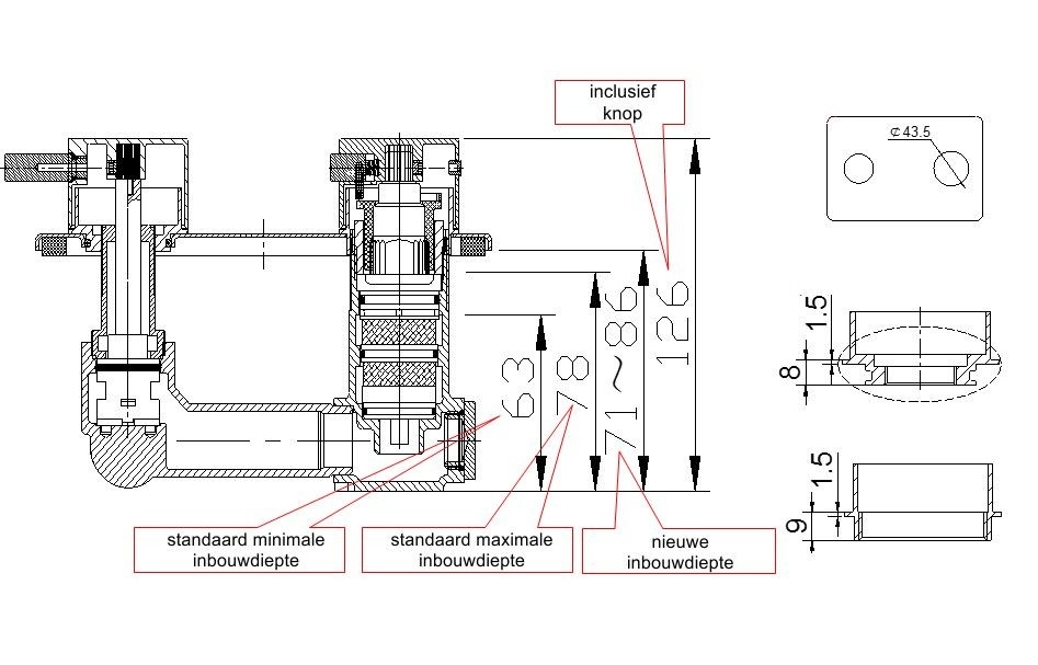 Oplossing wanneer het inbouwgedeelte van de inbouwdouchethermostaat 2 knops maximaal 8mm te diep in de muur is ingebouwd