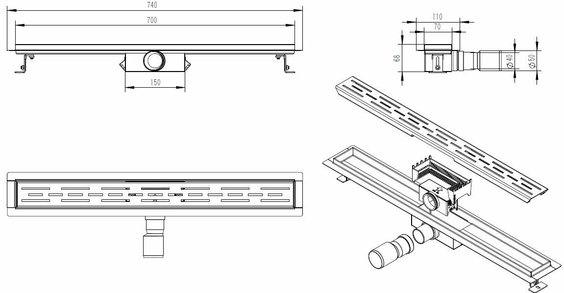 Wiesbaden douchegoot met flens en rooster 70 x 7cm | Mat zwart
