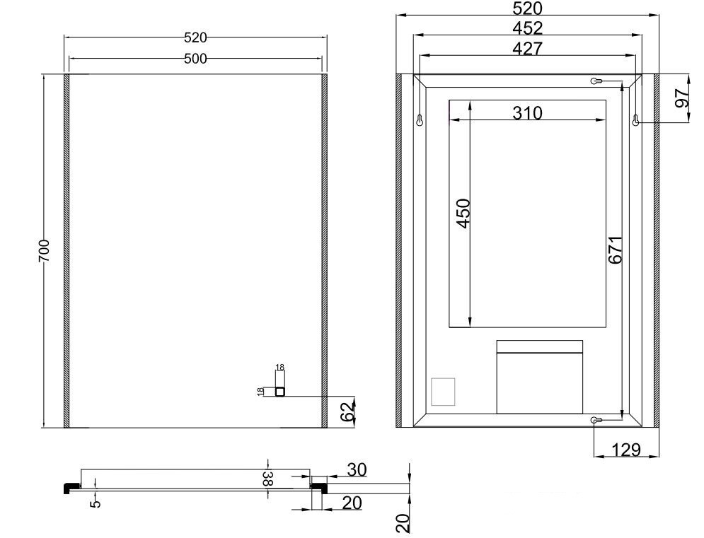 Voorzien van een spiegelverwarmings-mat van 250x350mm ter voorkoming van condensvorming