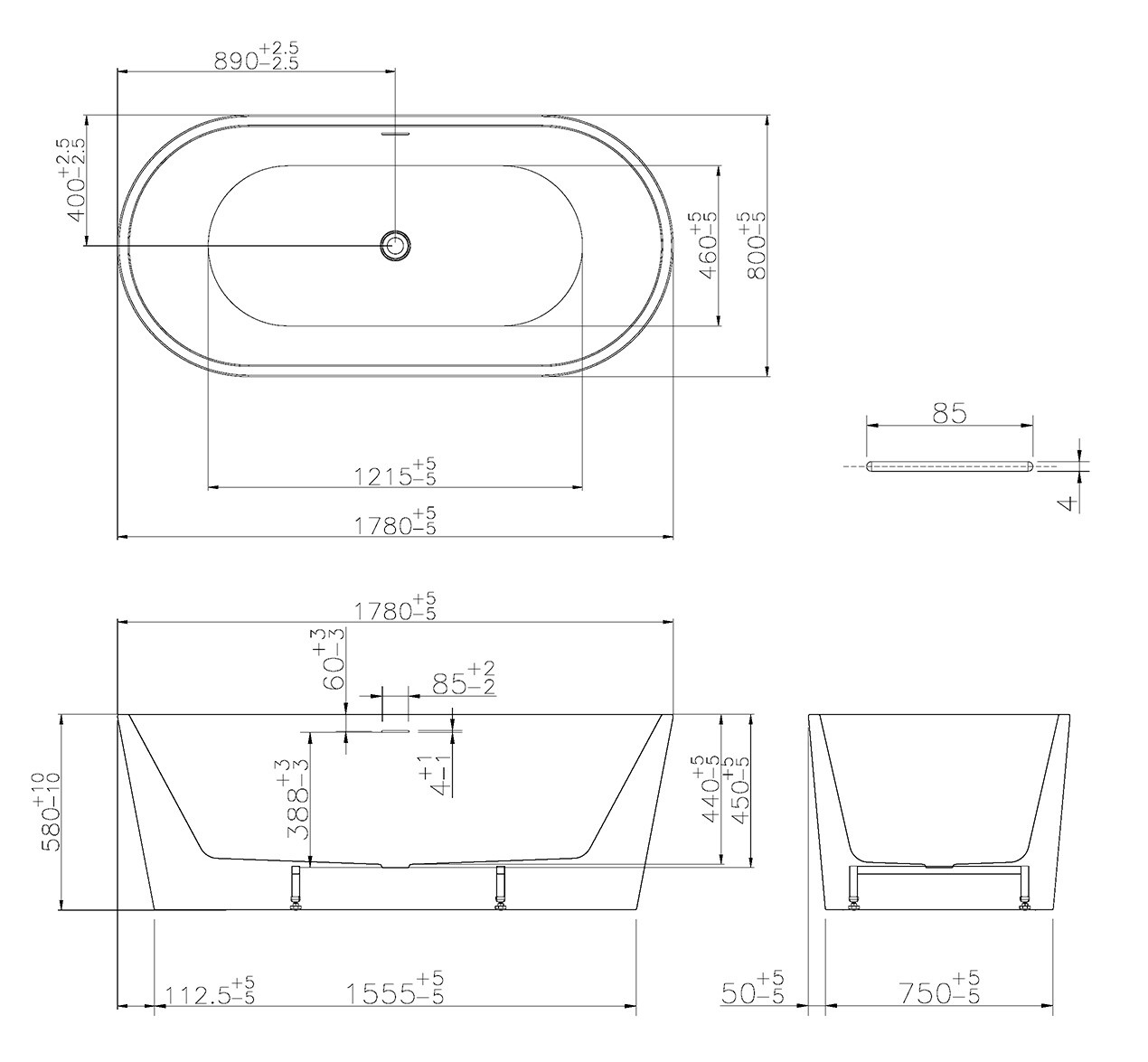 Wiesbaden Libero vrijstaand ligbad 178 x 80cm acryl | Glans wit | met waste | Glans wit