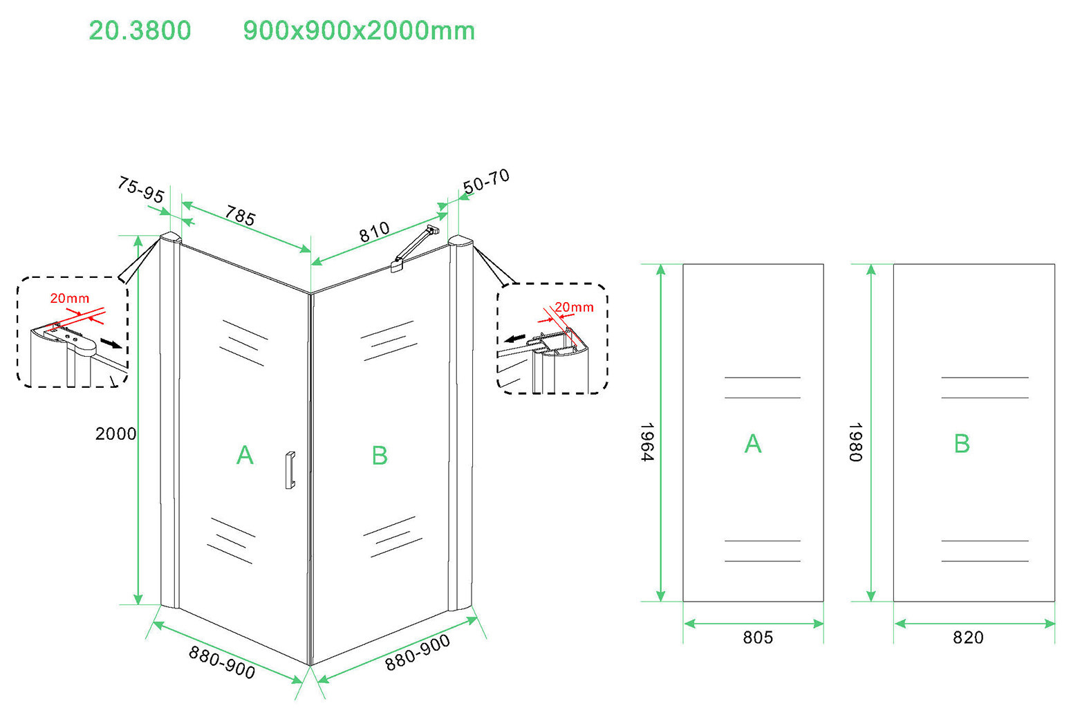 Deur 90cm, wand 90cm en 200cm hoog inclusief 2 chroom wand profielen welke 20mm aan beide zijden naar binnen verstelbaar zijn.