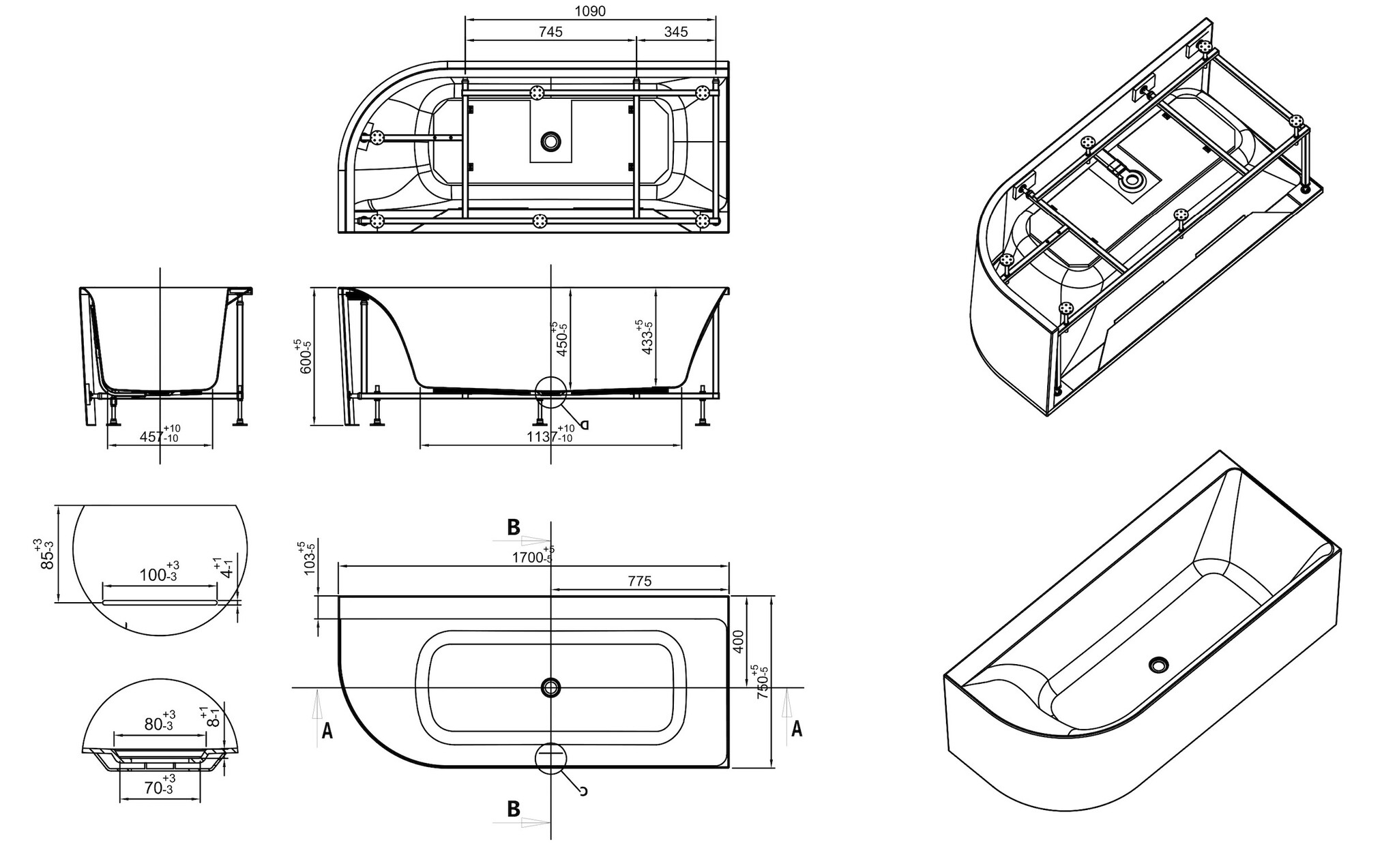 Het hoekbad heeft een afmeting van 170 x 75 cm en past perfect in een hoekopstelling. De brede rand van 10 cm aan de muurzijde biedt niet alleen een strakke afwerking, maar ook extra ruimte voor accessoires of een badrandcombinatie.